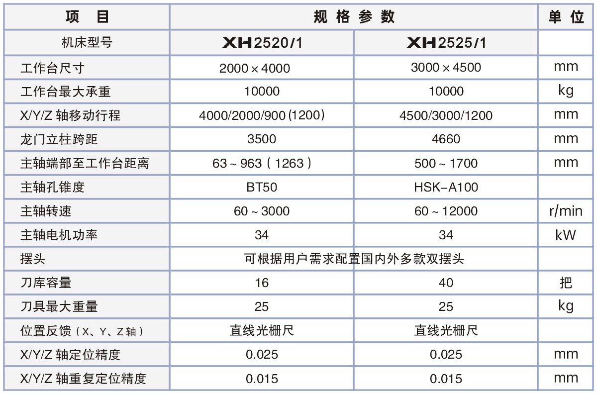 ■ XH25系列动梁龙门加工中心具有独特结构,其主要特点在于工作台落地, 三个方向的运动由横梁、滑座和滑枕铣头的运动来完成。 机床具有优良的动态响应特性, 超强的承载能力是同类机床的2~3倍。